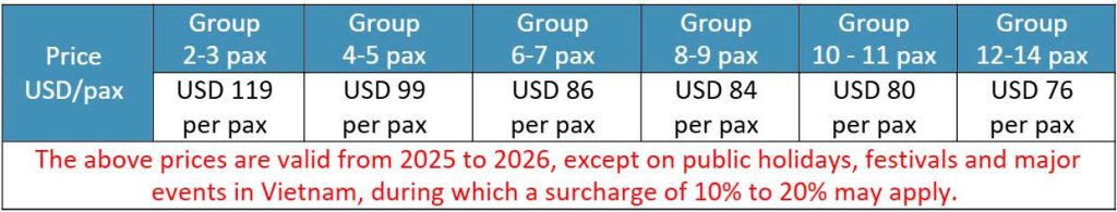 - Wrap up the day with a local dinner and a traditional Tedar show (on your own expense) celebrating Vietnamese folk culture.